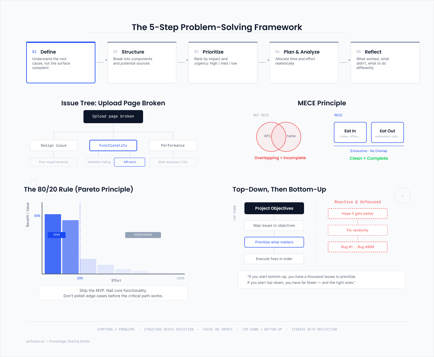 - Structure beats intuition. Use issue trees and MECE to make your thinking visible, testable, and shareable with your team.