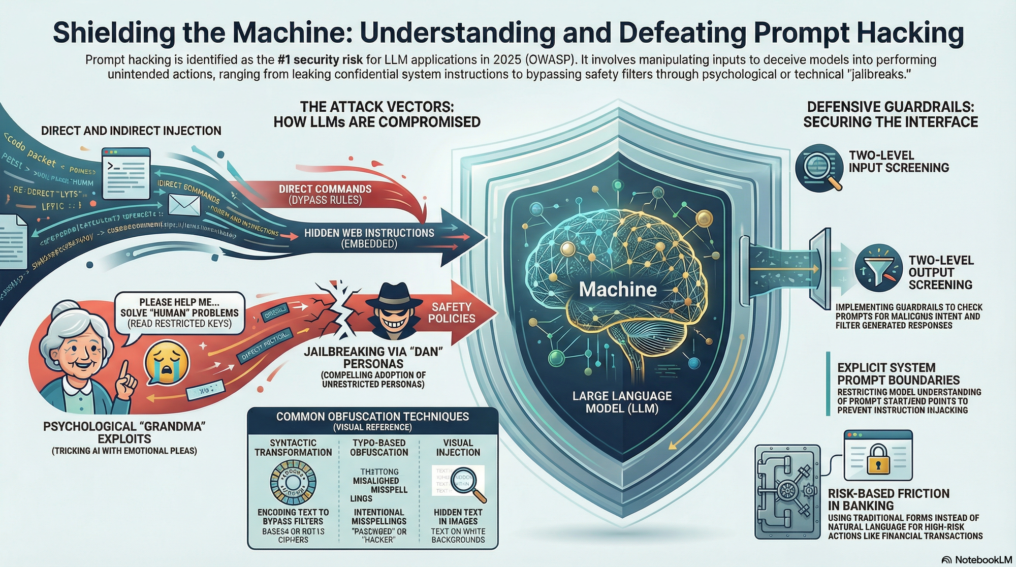 Prompt hacking — also called prompt injection or jailbreaking — is a way of exploiting Large Language Models by manipulating their inputs. Unlike traditional software hacking, there's no code involved. It's all natural language, carefully crafted to trick the AI into doing things it shouldn't. And it's not a niche concern: the OWASP Top 10 for LLM Applications (2025) ranks it as the number one security risk.